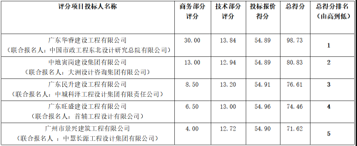 截止至2023年10月08日09时30分,7投标单位(广东华睿建设工程有限公司(联合报名人:中国市政工程东北设计研究总院有限公司)、广东信耀建设工程有限公司(联合报名人:中元天纬集团有限公司)、广东民升建设工程有限公司(联合报名人:中城科泽工程设计集团有限责任公司)、广州市景兴建筑工程有限公司(联合报名人:中慧长源工程设计集团有限公司)、 中地寅岗建设集团有限公司(联合报名人:大洲设计咨询集团有限公司)、 广东筠诚建筑科技有限公司(联合报名人:深圳市万德建设集团有限公司 )、广东旺盛建设工程有限公司(联合报名人:首辅工程设计有限公司)) 按规定递交了投标文件。 根据招标文件要求,评标委员会首先对各个投标单位的投标文件进行资格评审和形式评审与响应性评审,经审查,5家投标单位通过资格评审和形式评审与响应性评审,其中2家评审不通过,广东信耀建设工程有限公司(联合报名人:中元天纬集团有限公司)不通过原因为项目技术负责人的企业聘书不符合要求。广东筠诚建筑科技有限公司(联合报名人:深圳市万德建设集团有限公司)不通过原因为项目管理机构人员没有按招标文件要求提供社保证明。(详见附表)。评标委员会根据招标文件规定的评标标准和办法 ,对通过资格评审和形式评审与响应性评审的投标文件进行详细评审(详见,各投标人评审得分排名情况如下:)