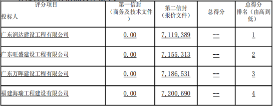 截止至2023年10月09日09时30分,共有5家投标单位(福建海瑞工程建设有限公司、广东润达建设工程有限公司、广东旺盛建设工程有限公司、广东万晖建设工程有限公司、广西智凌交通建设有限公司)按规定递交了投标文件。 评标记录: 1、第一个信封初步评审和详细评审 评标委员会首先对各个投标单位的第一信封(商务及技术文件)进行资格评审和形式评审与响应性评审,经审查,5家投标单位均通过资格评审和形式评审与响应性评审。评标委员会对通过第一信封(商务及技术文件)资格评审和形式评审与响应性评审的投标文件进行技术商务评分。通过第一信封详细评审的五家单位如下:福建海瑞工程建设有限公司、广东润达建设工程有限公司、广东旺盛建设工程有限公司、广东万晖建设工程有限公司、广西智凌交通建设有限公司。 2、第二个信封初步评审和详细评审 评标委员会评审完第一个信封后,接着第二个信封(报价文件)进行形式评审与响应性评审,经审查,4家投标单位通过形式评审与响应性评审,其中1家评审不通过,广西智凌交通建设有限公司不通过原因为工程量固化清单中的投标报价和投标函金额报价不一致。通过形式评审与响应性评审的第二信封(报价文件)再进行评标价评分。 3、各投标人得分情况具体如下: